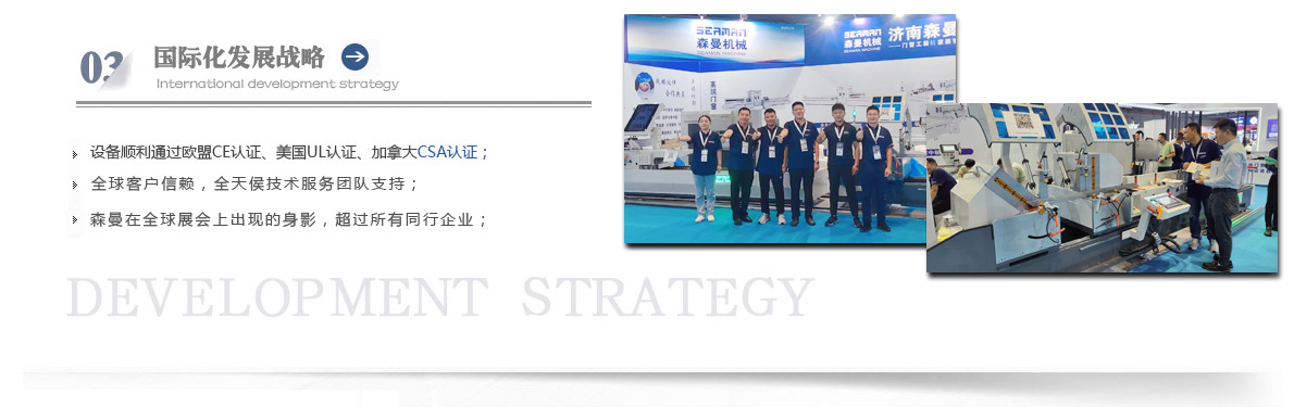“森曼機械”作為全球門窗設備供應商,本著"seaman"精神,勇立潮頭,拼搏創(chuàng)新,以爭做行業為目標,在行業前輩發(fā)展的基礎上,努力學習,積極進取。目前公司產品涵蓋塑料門窗設備、鋁合金門窗設備、鋁幕墻設備、鋁木復合門窗設備及中空玻璃設備五大種類,近百個品種。公司產品銷售至全國各地及東南亞、非洲、東歐、北美等幾十個國家和地區。在這個競爭激烈的年代,我們正努力使我們的產品!